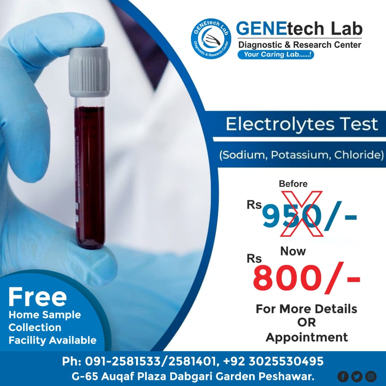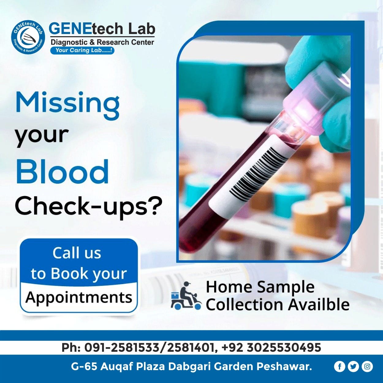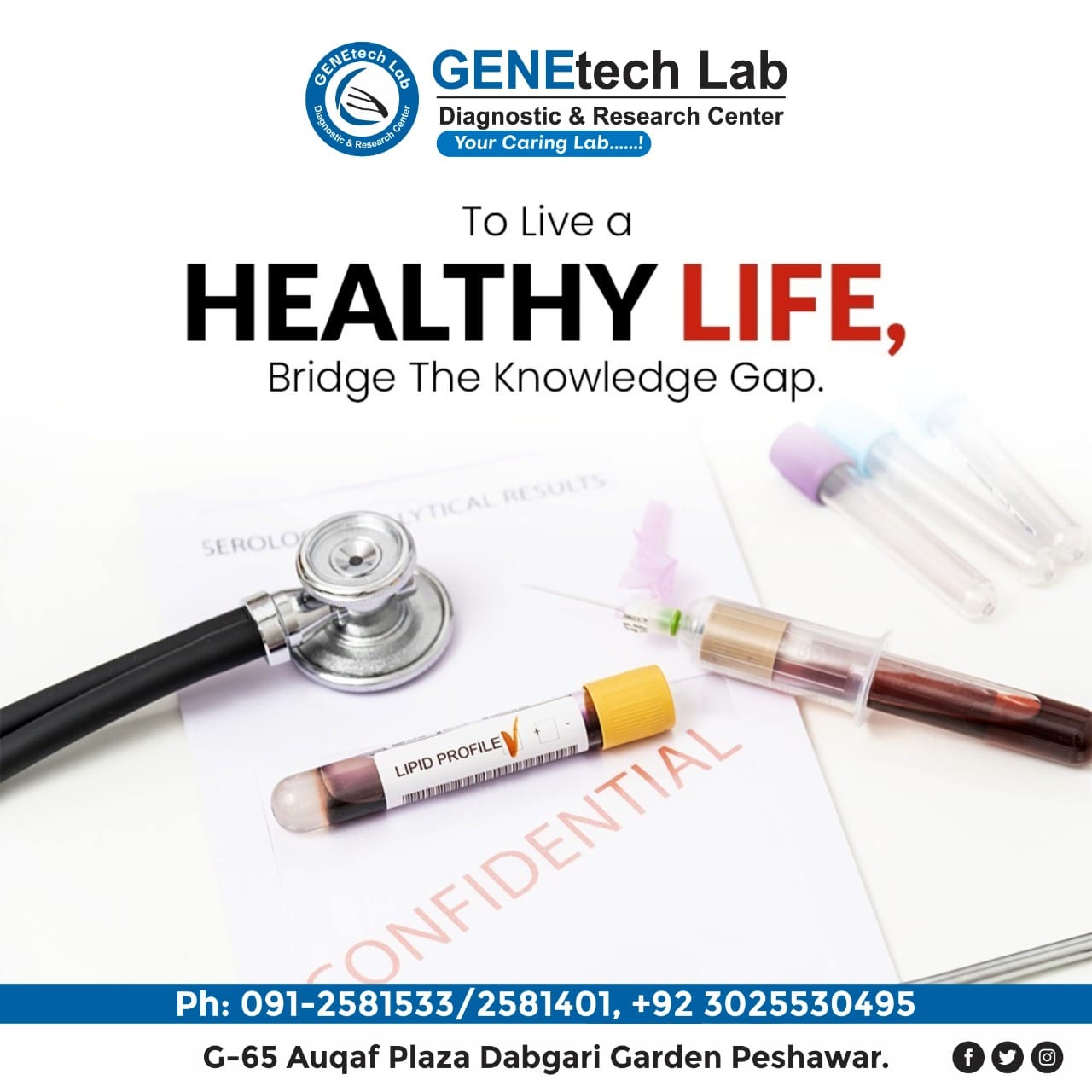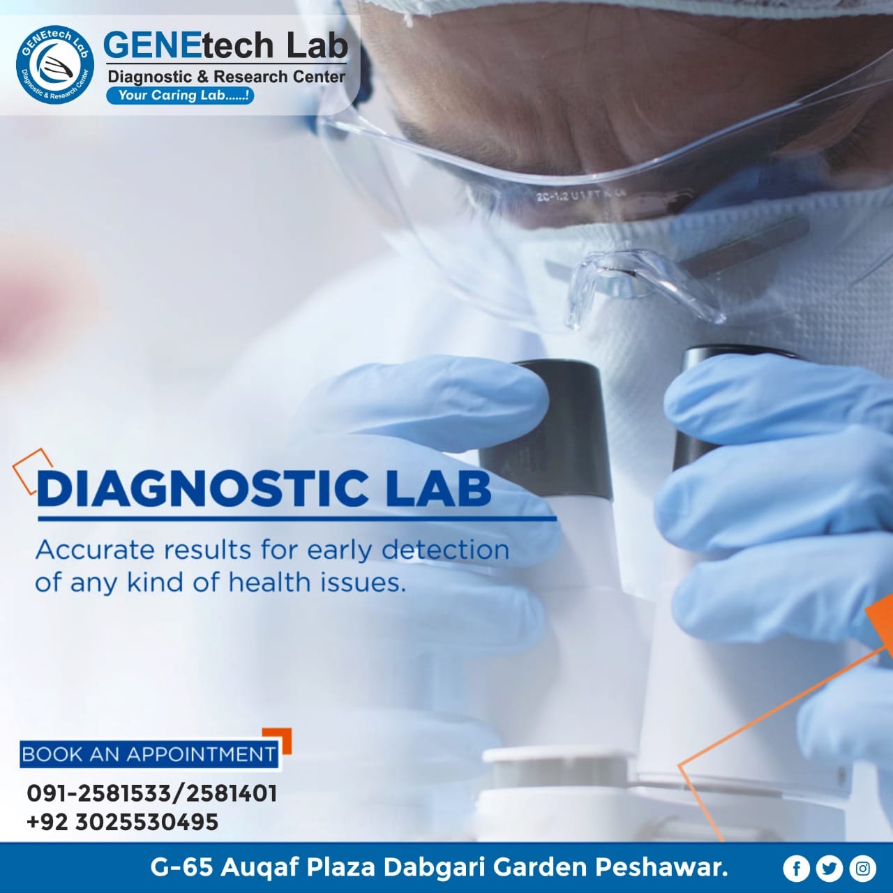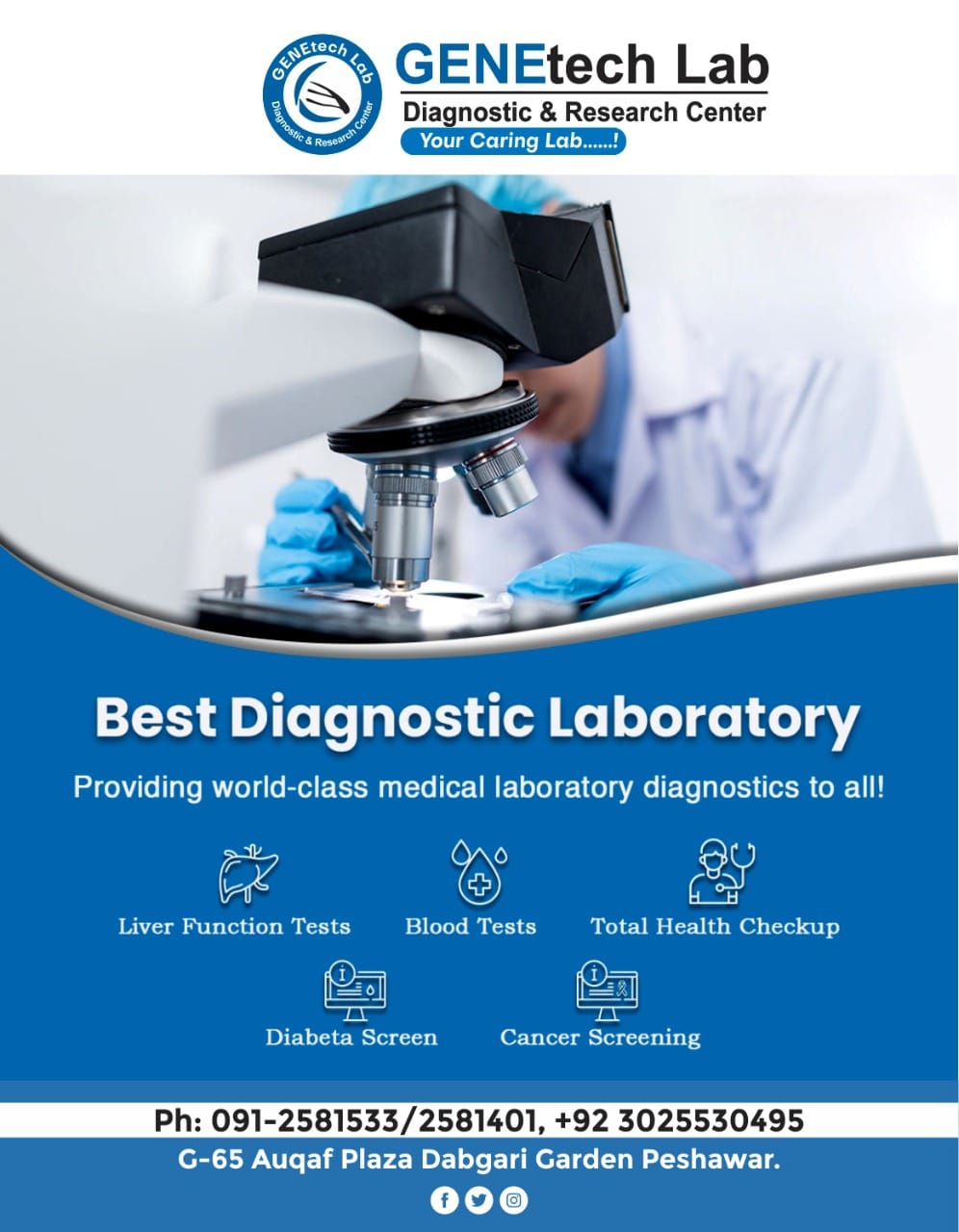 GENEtech Lab Diagnostic and Research Centre was established in 2014. The lab is facilitating superior quality diagnostics services to its customers through a very efficient network of labs and collection points. We use fully automated instruments for lab tests with best accuracy and precision. This enables the lab to report test results quickly without ever compromising on quality. It is because of this reputation of uncompromising quality and quick reporting time that is the reference lab of choice for multiple hospitals and labs.