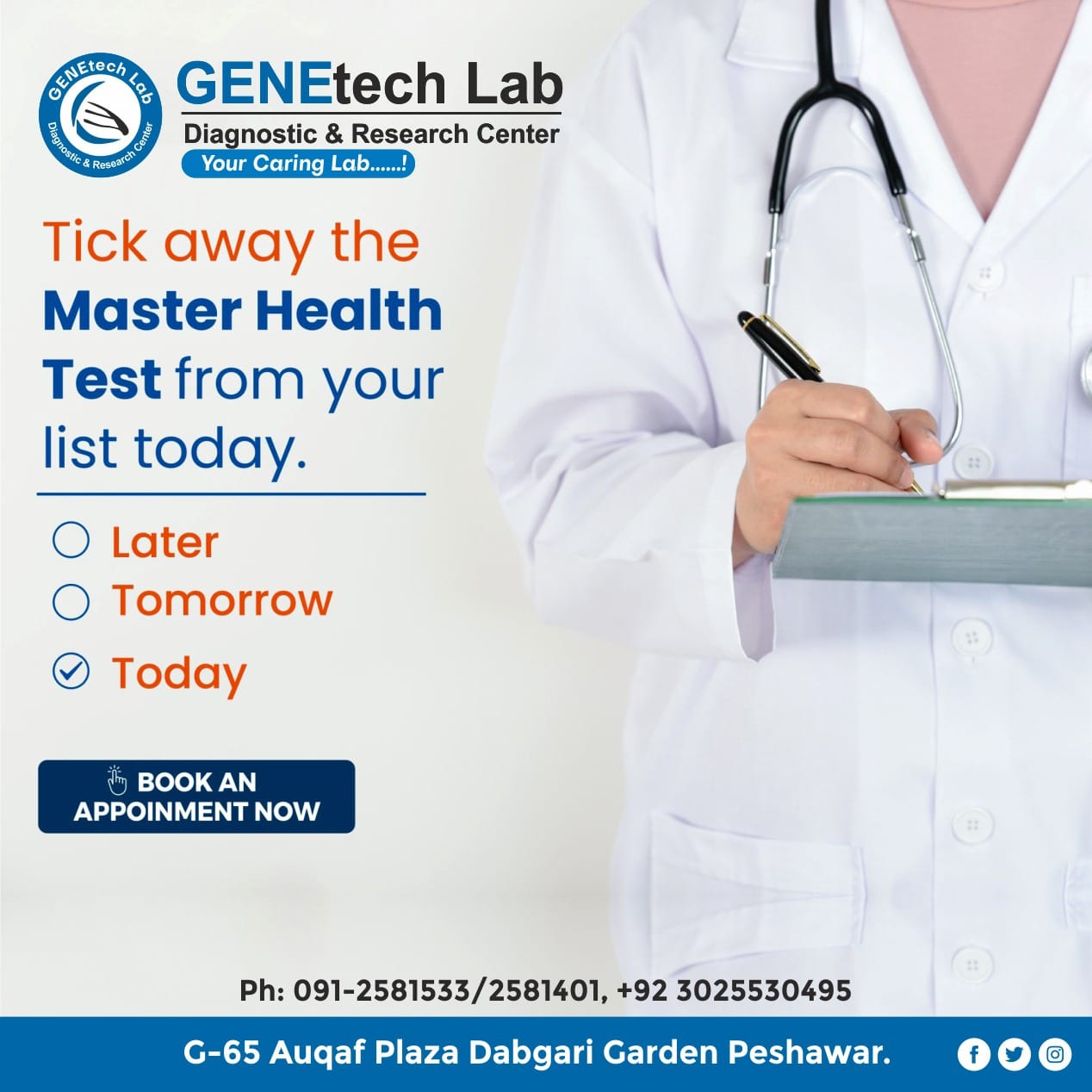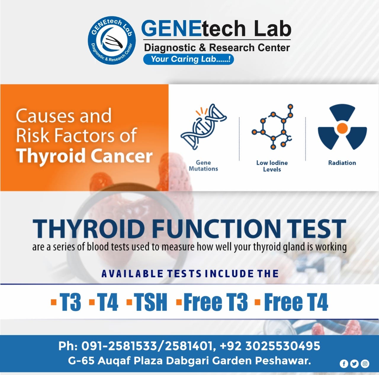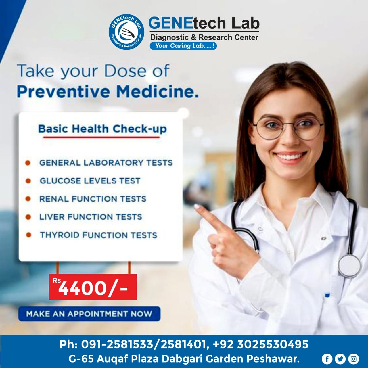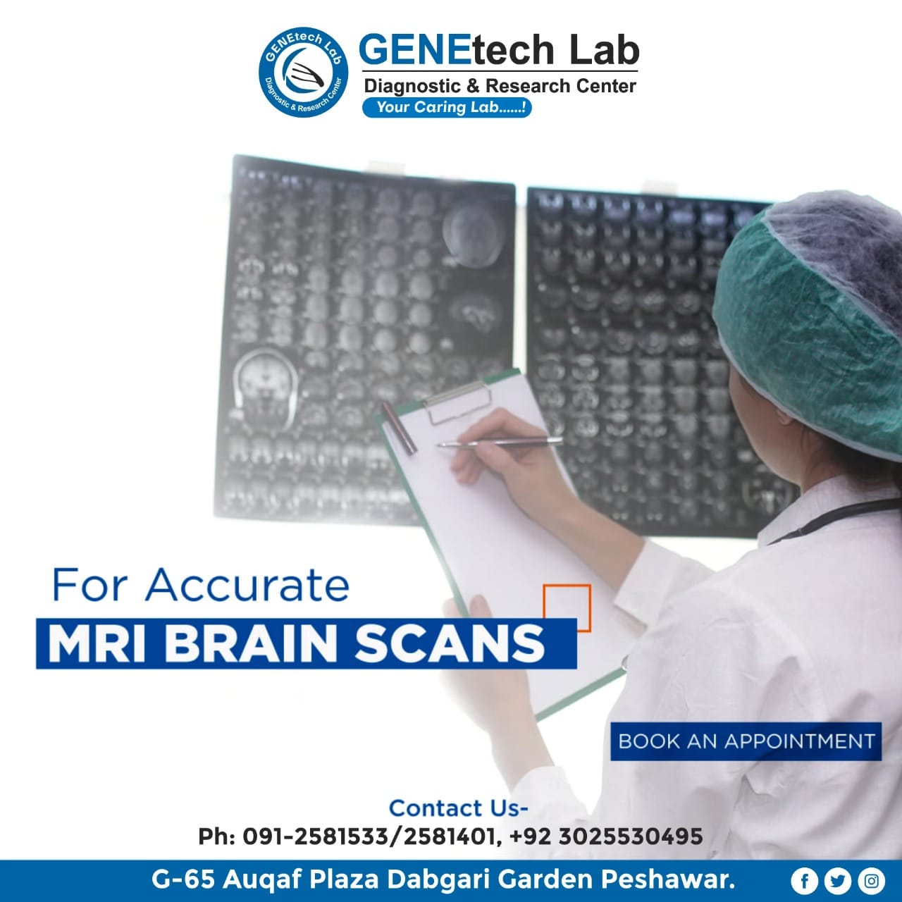 GENEtech Lab Diagnostic and Research Centre was established in 2014. The lab is facilitating superior quality diagnostics services to its customers through a very efficient network of labs and collection points. We use fully automated instruments for lab tests with best accuracy and precision. This enables the lab to report test results quickly without ever compromising on quality. It is because of this reputation of uncompromising quality and quick reporting time that is the reference lab of choice for multiple hospitals and labs.